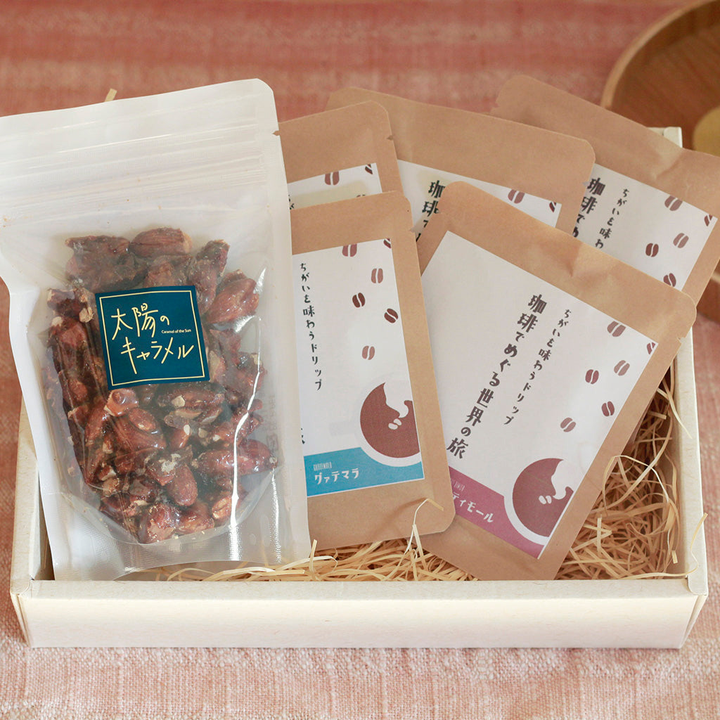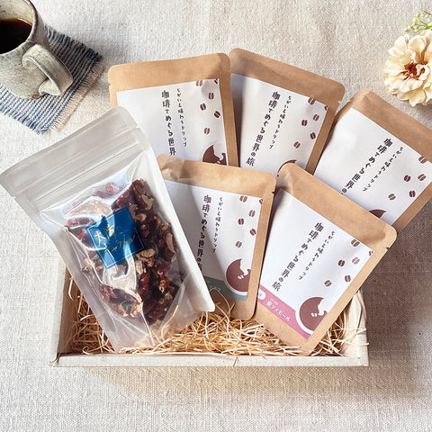 こちらは店舗でも人気のご褒美スイーツと、ドリップコーヒー5種が入ったおやつセットです。