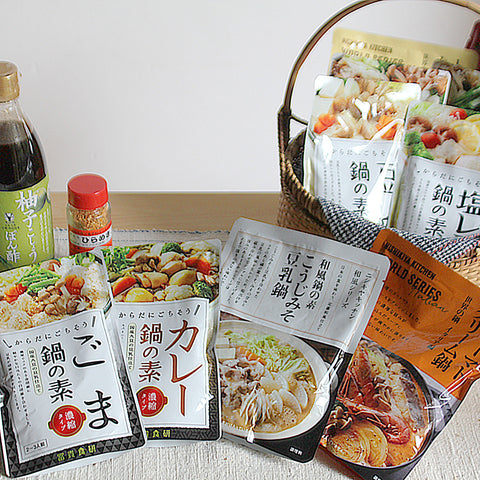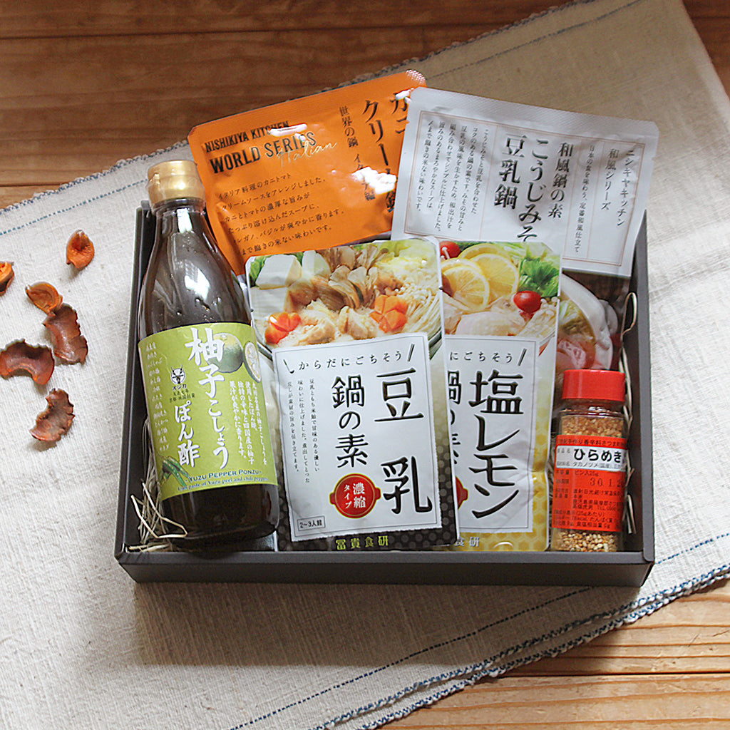 そんなこれからの時期にお届けしたいのが、いろいろな種類の鍋の素、さらに鍋によく合う唐辛子、ポン酢を加えた「季節のおたのしみ便」です。